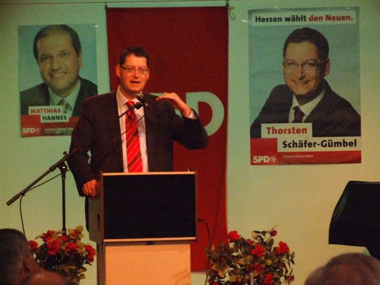 erzählt von seiner Jugend in der Gießener Nordstadt - keine gute Gegend - in der er sich mit seinen zwei Brüdern ein neun Quadratmeter großes Zimmer teilte. Er habe zunächst eine Empfehlung für die Realschule bekommen, während die Kinder aus besseren Stadtteilen gleich aufs Gymnasium geschickt worden seien. Deshalb sei ihm die Bildungspolitik so wichtig. Er schlägt den Bogen zum Nachbarland Rheinland-Pfalz: In allen wichtigen Politikbereichen liege Hessen inzwischen hinten: Sei es im Bildungsbereich, wo Hessen in allen wichtigen Vergleichsuntersuchungen von Rheinland-Pfalz überholt wurde - beispielhaft nennt er den IGLU-Test für die Lesefähigkeit von Grundschülern: Hier war Hessen das einzige Bundesland, das sich in den vergangenen Jahren nicht verbessert, sondern verschlechtert hat. Reaktion von Kultusminister Banzer laut Schäfer-Gümbel: "Wir sollten den Test abschaffen". Besonders gravierend der Vergleich der Wirtschaftsdaten nach 10 Jahren Koch-Regierung mit dem SPD-geführten Rheinland-Pfalz: Das ehemals strukturschwache ländlich geprägte Nachbarland habe inzwischen eine wesentlich günstigere Entwicklung der Arbeitslosigkeit als Hessen. Kein Wunder, schließlich hat Koch selbst in seiner Regierungszeit rund 10.000 Stellen unter anderem für Polizisten, Lehrer oder Forstmitarbeiter gestrichen. Vor allem aber Koch mit seiner ideologisch begründeten Ablehnung des Mindestlohns die Grundlagen für ein Lohndumping geschaffen, das inzwischen für viele kleine und mittlere Unternehmen in Hessen zur Existenzbedrohung geworden ist. Und so sei Koch auch kein Wirtschaftsexperte, sondern allenfalls ein Experte für Wirtschaftslobbyismus. Offenbar hat der selbsternannte zukünftige Ministerpräsident die Wahl noch nicht aufgegeben. Die Umfragen, wonach die SPD mehr als 15 Prozentpunkte hinter der CDU liegt, könnten ihn nicht schrecken, sagt "TSG". Schließlich seien 45 Prozent der Wähler noch unentschlossen. Zu Abschied fordert er seine Anhänger noch auf, in den letzten Tagen noch einmal alles zu geben - und verlässt die Sitzung mit seinem "lebenden Navigationssystem", Jens-Christoph Pieper aus Eppstein, der in der ZDF- Sendung „Wetten dass“ mit seinem ausgezeichneten Gedächtnis für Autobahnen geglänzt hatte und jetzt den SPD-Spitzenkandidaten zum nächsten Wahltermin durch Hessen fährt. Nächster Redner war der Rheinland-Pfälzische Innenminister und stellvertretende Ministerpräsident Karl Peter Bruch. Der stieg dankbar auf die von Schäfer-Gümbel vorgelegten Landesvergleiche ein und untermauerte sie mit Details. Als ehemaliger Bügermeister erläuterte er die Möglichkeiten, mit einer Politik der kleinen Schritte am Ende tatsächlich vorn zu liegen - und "dabei die Menschen mitzunehmen". So endete die Veranstaltung als hohe Motivation für alle Anwesenden (so begrüßte der Ortsvereinsvositzende Heiko Schmale unter anderem die beiden Landtagskandidaten Marius Weiß und Matthias Hannes, die langjährige Landtagsabgeordnete Christel Hoffmann, Landrat Burkhard Albers und Alt-Landrat Klaus Frietsch, den UB-Vorsitzenden und Bundestagskandidat Martin Rabanus und den Juso-Vorsitzenden Carsten Sinß).